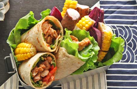 Step 5: Heat the tortilla over medium-low heat, crack an egg on it, take it out of the pan when the egg liquid solidifies, spread sweet bean sauce on it, then add the chicken strips, lettuce, and cucumber.